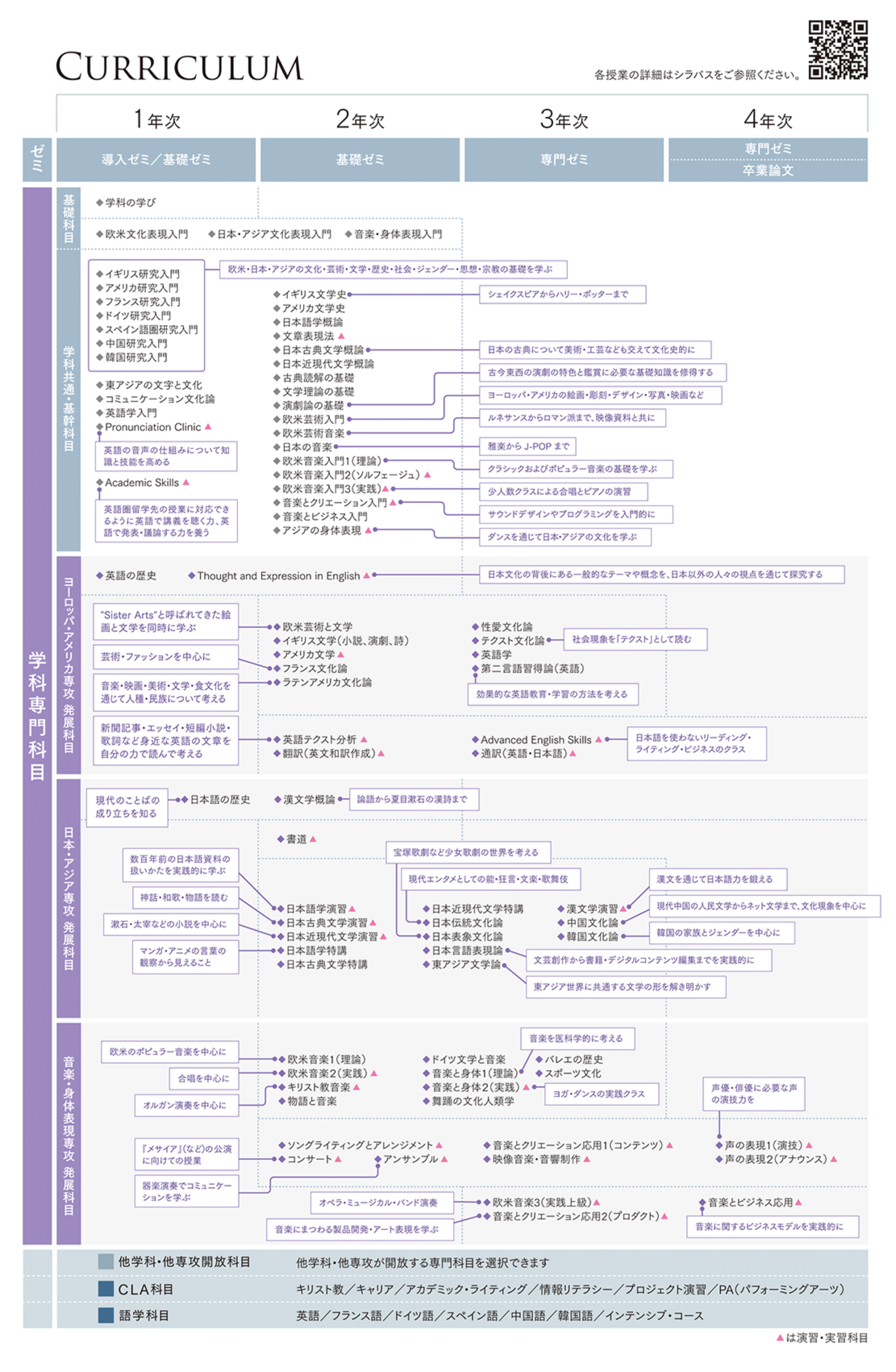 西洋・アジアの伝統芸術から現代のパフォーマンスまで幅広く学び、表現力や創造性、他者と感情や価値を共有する力を養います。舞台芸術や音楽産業、教育機関などでの活躍をめざします。