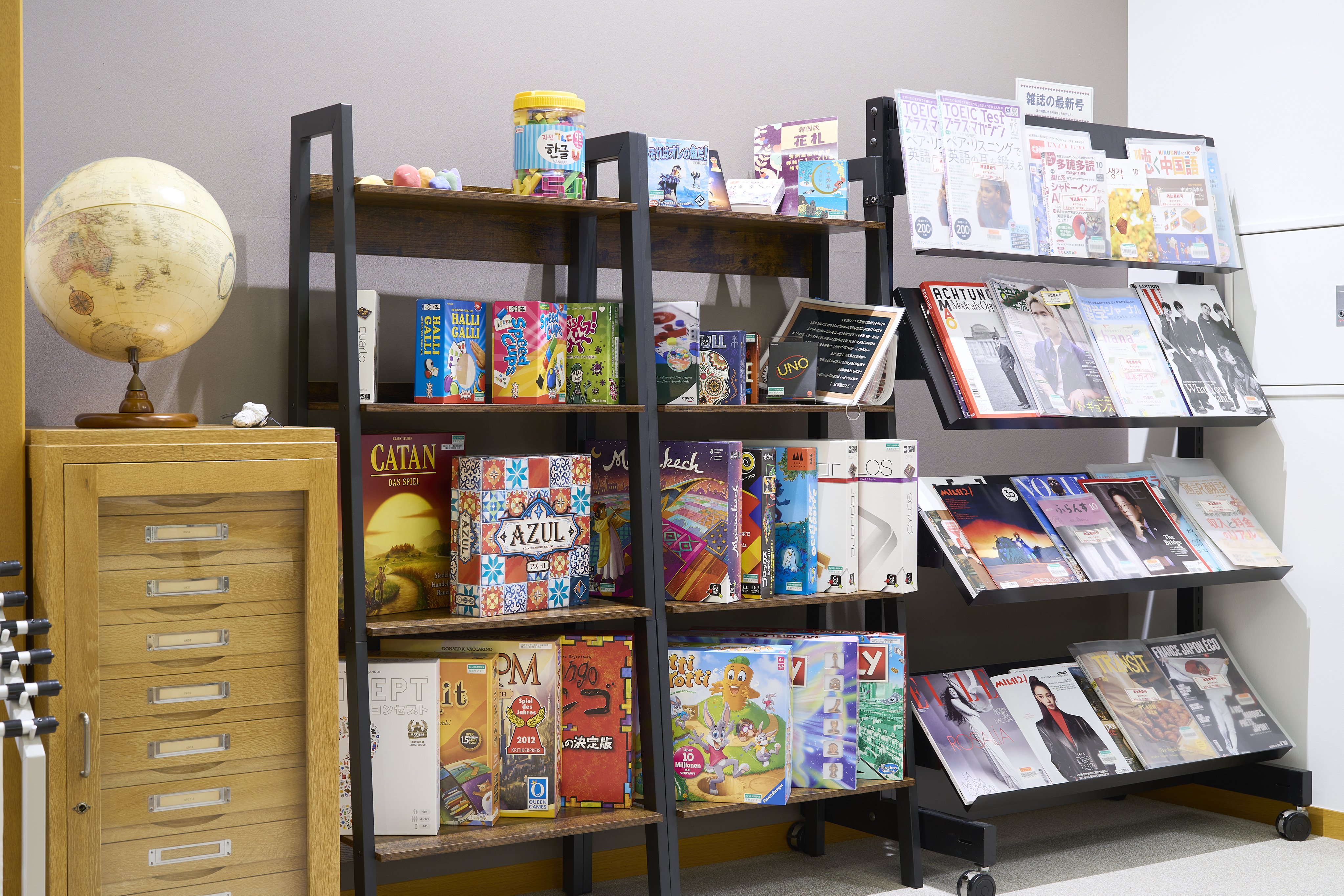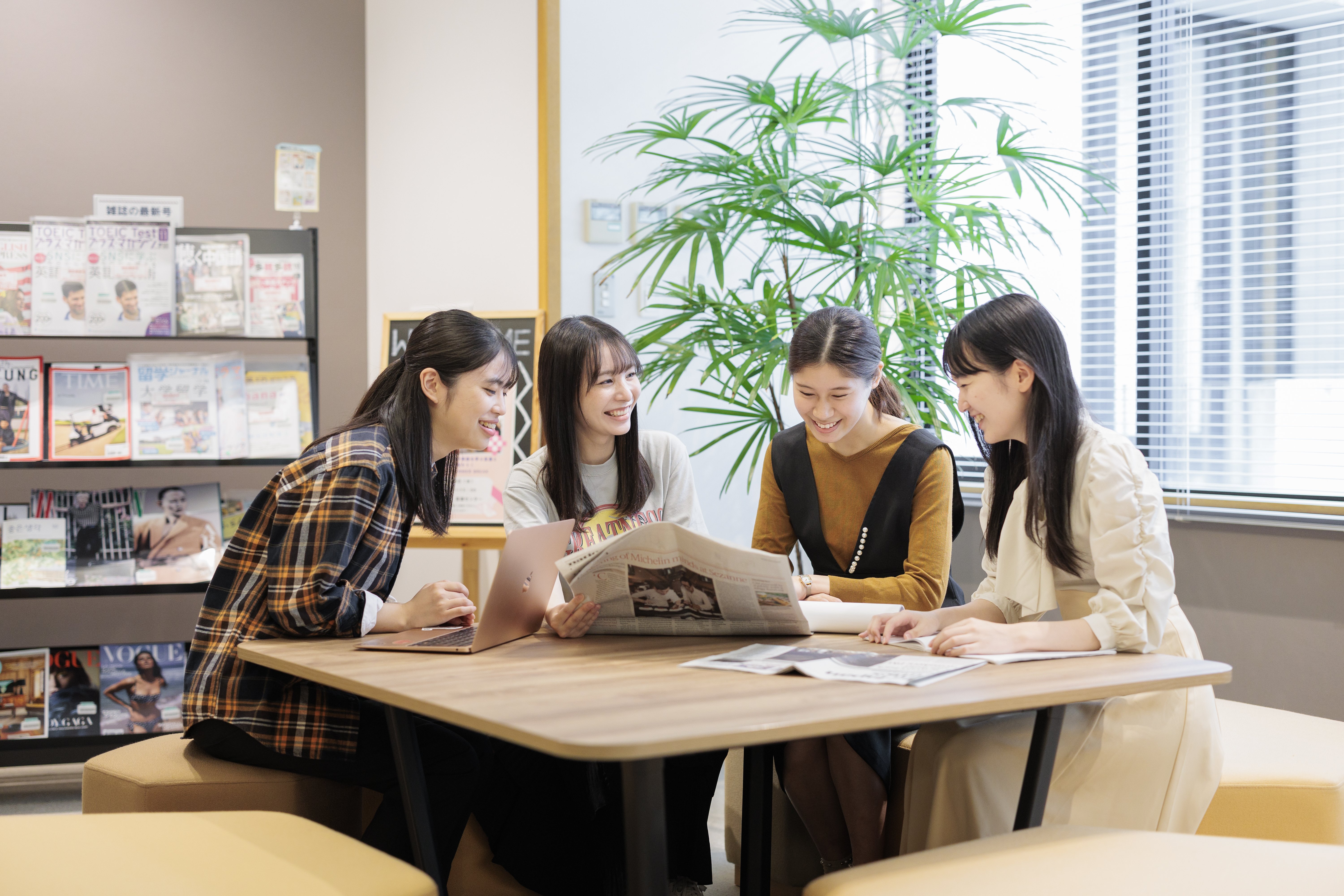 言語センターは、語学の相談から「話せるようになる」ための環境づくりまで、学生の語学学習を幅広く支えています。窓口では、勉強の進め方や検定試験について気軽に相談でき、参考書や映像教材、各種検定の案内も自由に手に取ることができます。集中して勉強したい人向けの一人用ブースや、教員・先輩・友だちと気軽に語り合えるカフェ風スペースがあります。さらに、ネイティブ教員や先輩学生のLLA(Language Learning Assistant)と話せる語学学習カウンセリングや語学カフェなど、前向きに学び続けられる仕組みがそろっています。