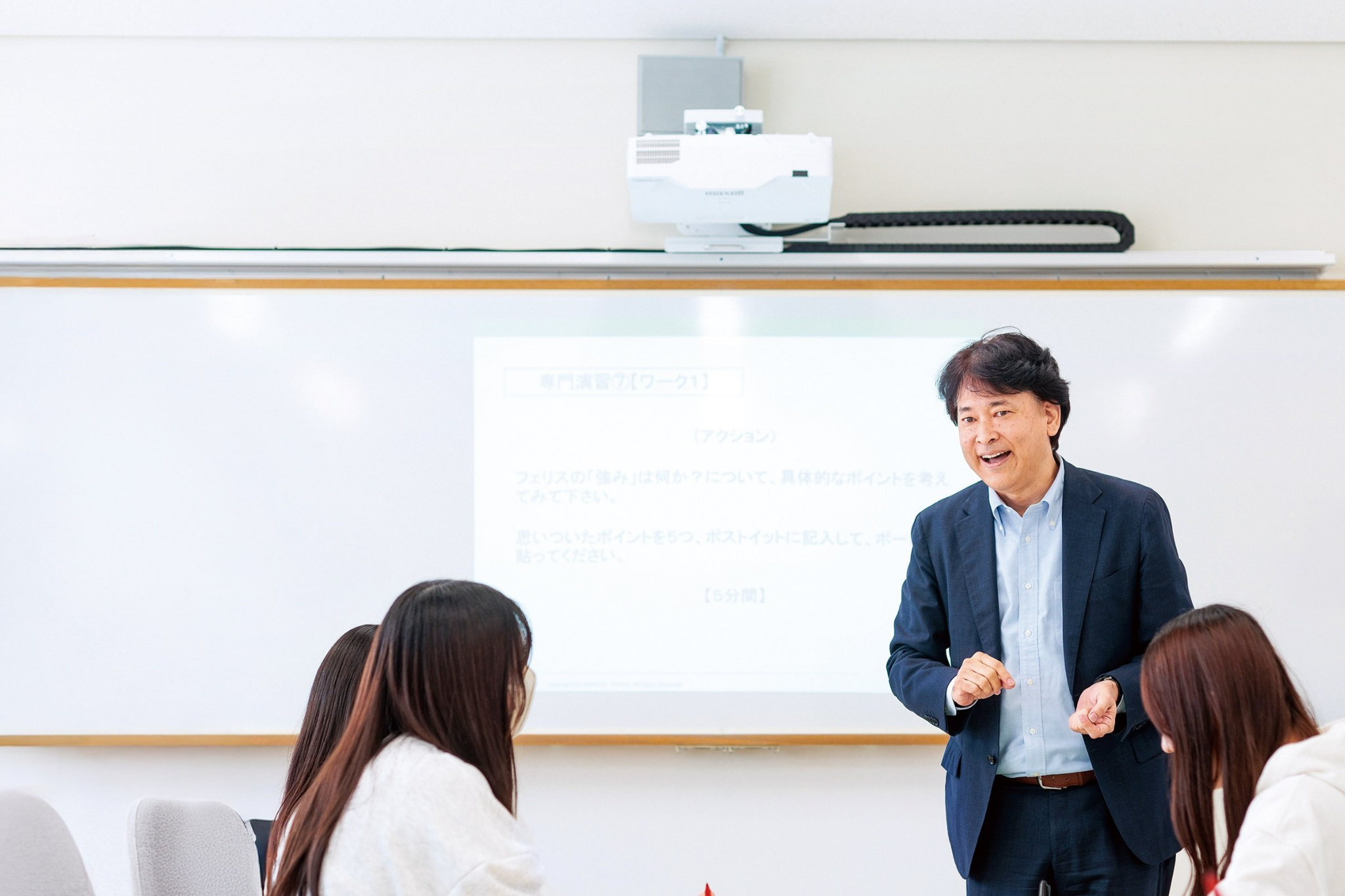フェリスでは、1年次からゼミに所属します。高校までのように大きな集団で学ぶのではなく、自分の関心や考えを表現し、小さな挑戦や試行錯誤を通して確かな成長へとつなげていきます。ゼミは7~15名程度と少人数で、発言しやすく、発表・プレゼンテーションの機会も多くあります。教員からの丁寧できめ細やかなフィードバックを受けながら、実践的な力を身につけることができます。