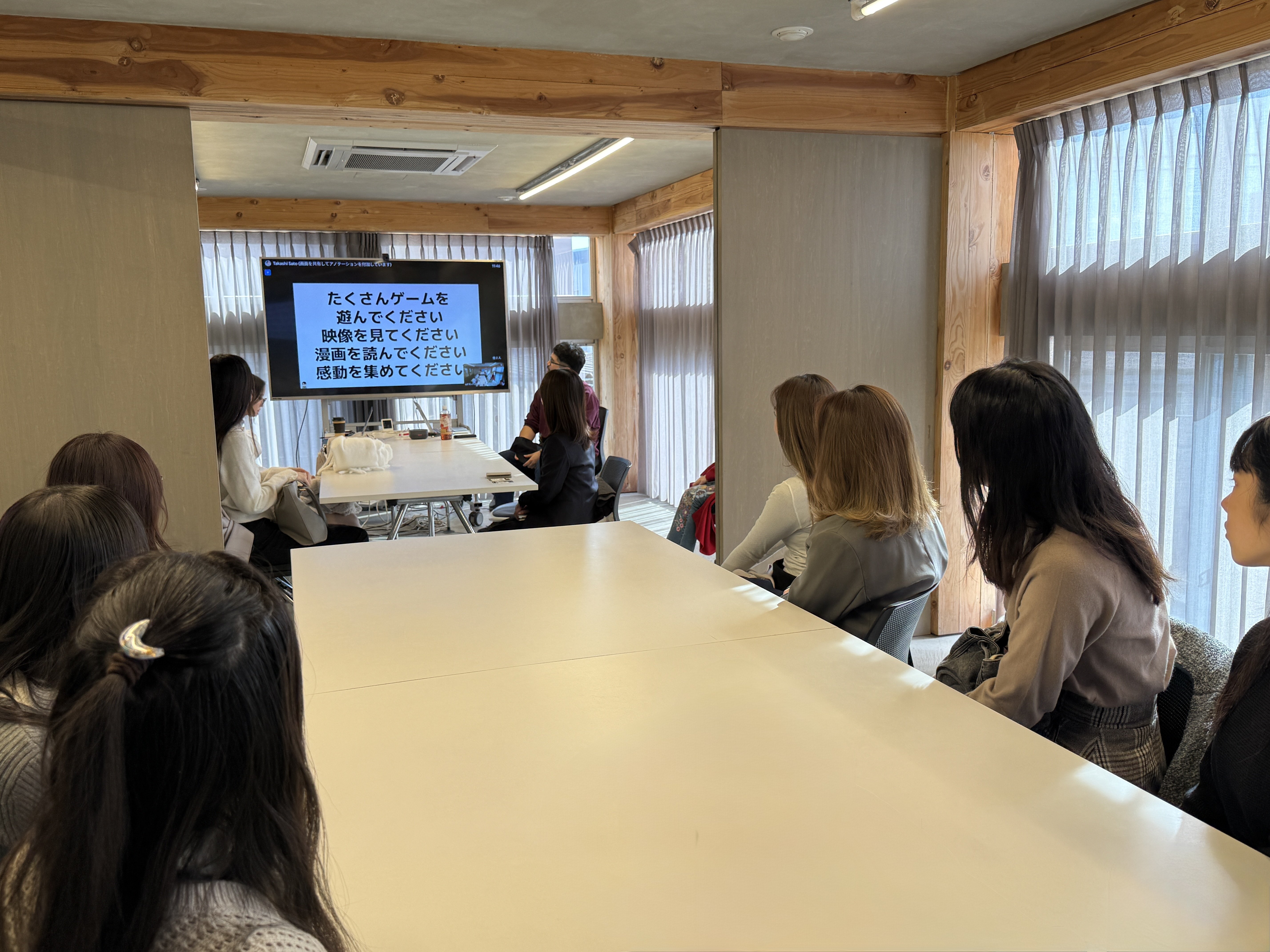 竹野真帆(文学部コミュニケーション学科/グローバル教養学部心理コミュニケーション学科)ゼミの学生が、12月11日(木)、ゲーム開発やクリエイティブ制作で知られる面白法人カヤック(本社:鎌倉市)を訪問し、ゲーム事業部の佐藤宗(たっくる)さんによる特別講演と総務・社長秘書の本間利沙(リサ)さんオフィスツアーに参加しました。