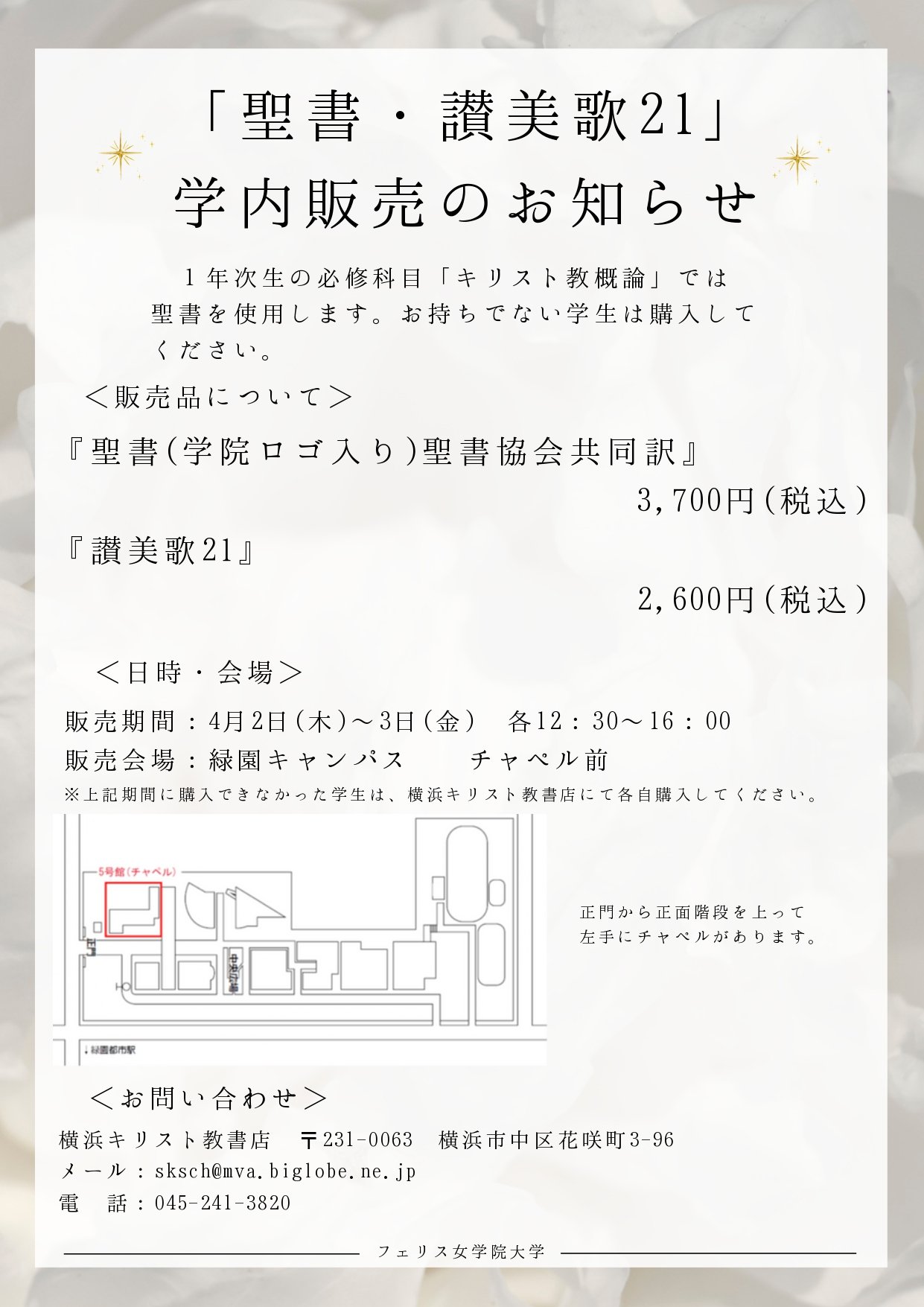 聖書・讃美歌は、4月上旬(授業開始前)に緑園キャンパスにて販売いたします。詳細は以下のチラシをご覧ください。