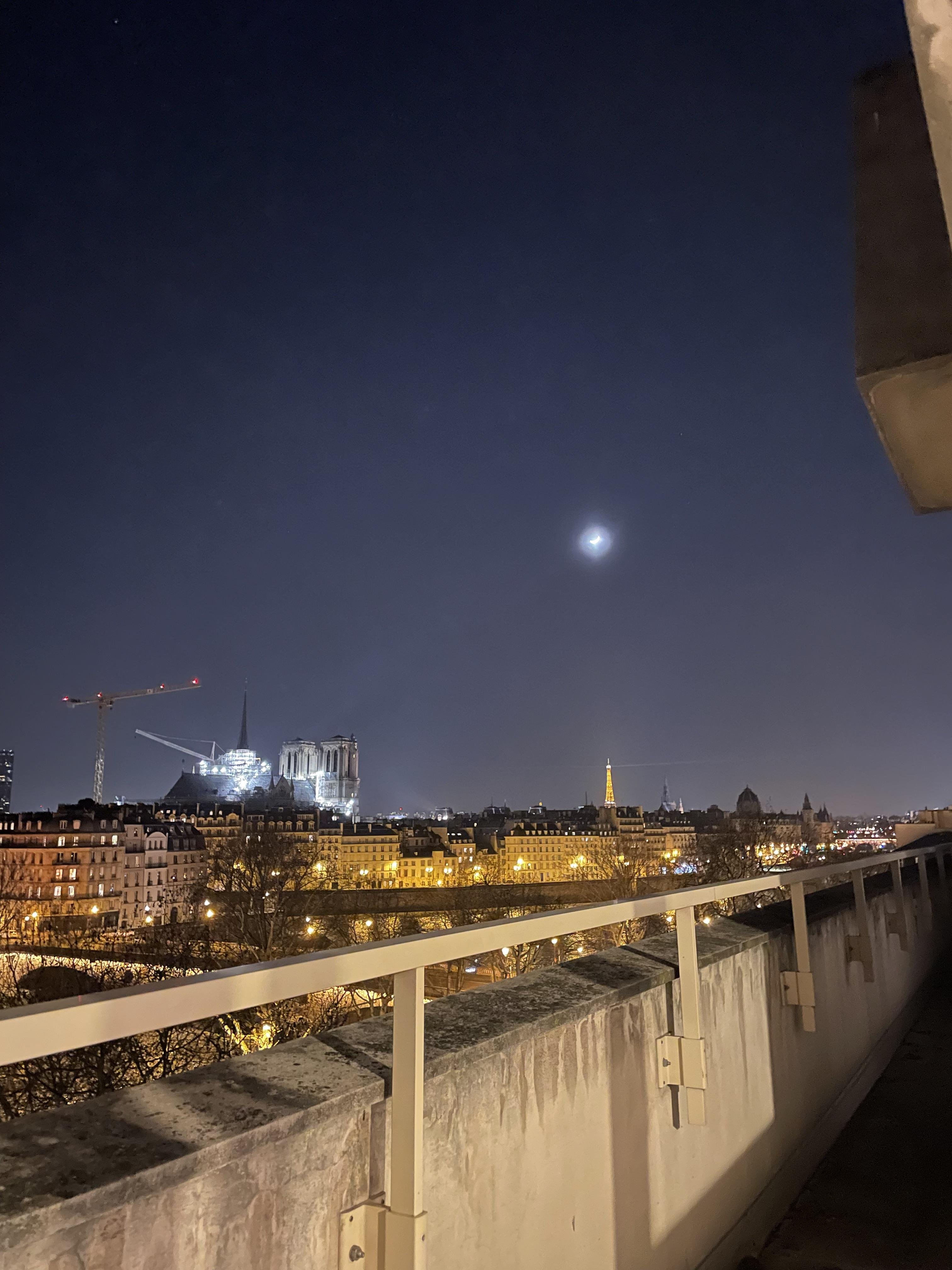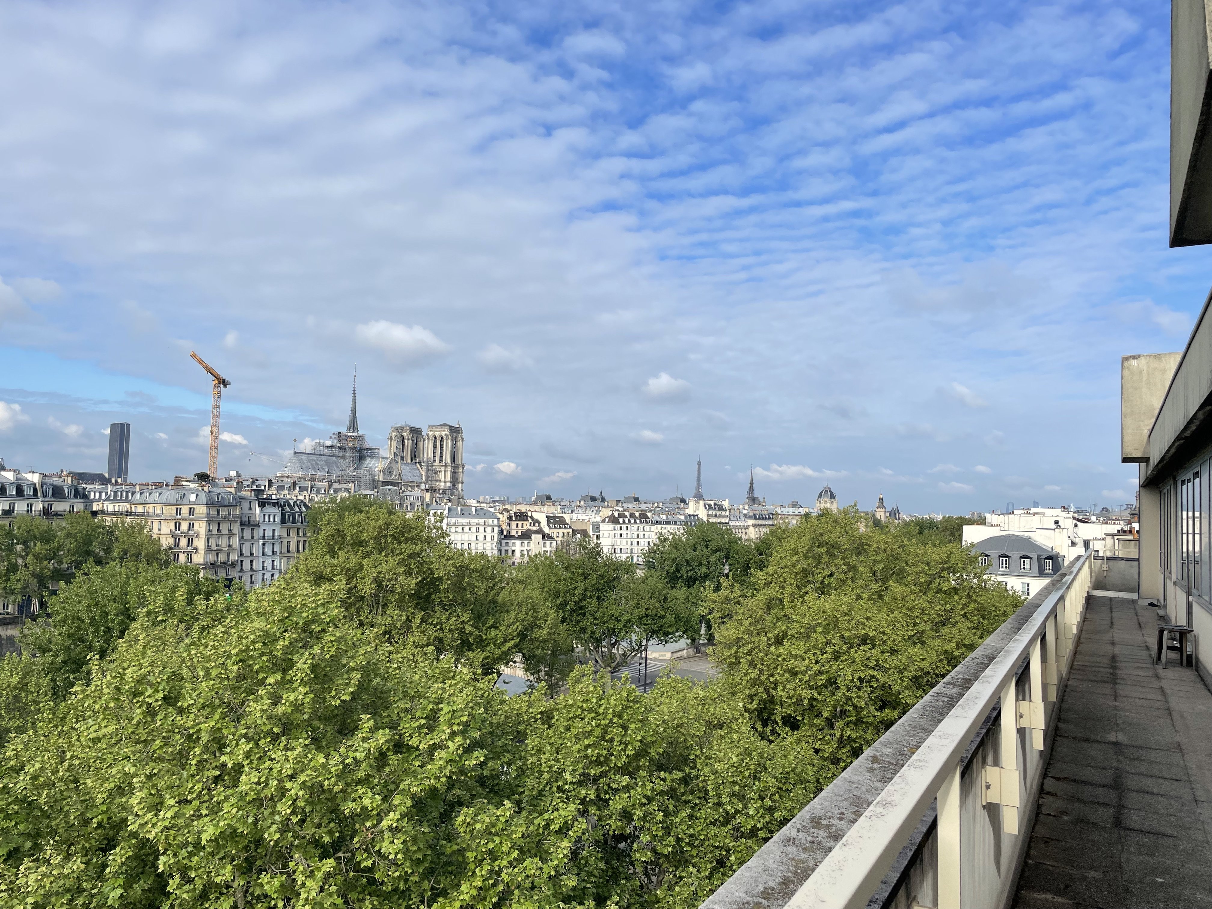 研修計画に書いたもう一つの目的、作曲をするということは丁度滞在を始めた時に全音から出版される自作の最終校正のタイミングで夜のセーヌ川の景色を見て思いついた作品のタイトルを改めて噛み締めながらその作業をした。作品として仕上がったのはもう一つ管楽器合奏のための小品、それと結局途中になってしまったものに限られた。当初はIRCAMとコンタクトを取ってそこで研修というか色々な作業を考えていたが、現在フランスの現代音楽界(作曲)がいわゆる知的な音楽と聴衆に働きかけるものと二極化しているとの説明をさまざまな作曲家から受け、現在のIRCAMのスタイルは自分には合わないと周りからの助言もあり、諦めた。私の場合フランスで労働できるヴィザ、滞在許可証を持っての(Passport talent)の滞在だったので、すぐにこれからの利用者と条件が合うとは思えないが、私に割り当てられた8521は右にノートルダム寺院、その奥にエッフェル塔が見えて眼下にはセーヌ川が流れているというまさにパリを象徴する景観のアトリエなので、そこからの眺望を見ながらイル・ド・フランスの特徴のすぐに変わる雲の色と天候を観察すればフランスの作曲家の色彩感は実感できると思う。今年で開館60年のここを皆さんで利用して自分の音楽人生に活用されることを望んで止まない。またこのような機会を与えてくださったフェリスに感謝する。