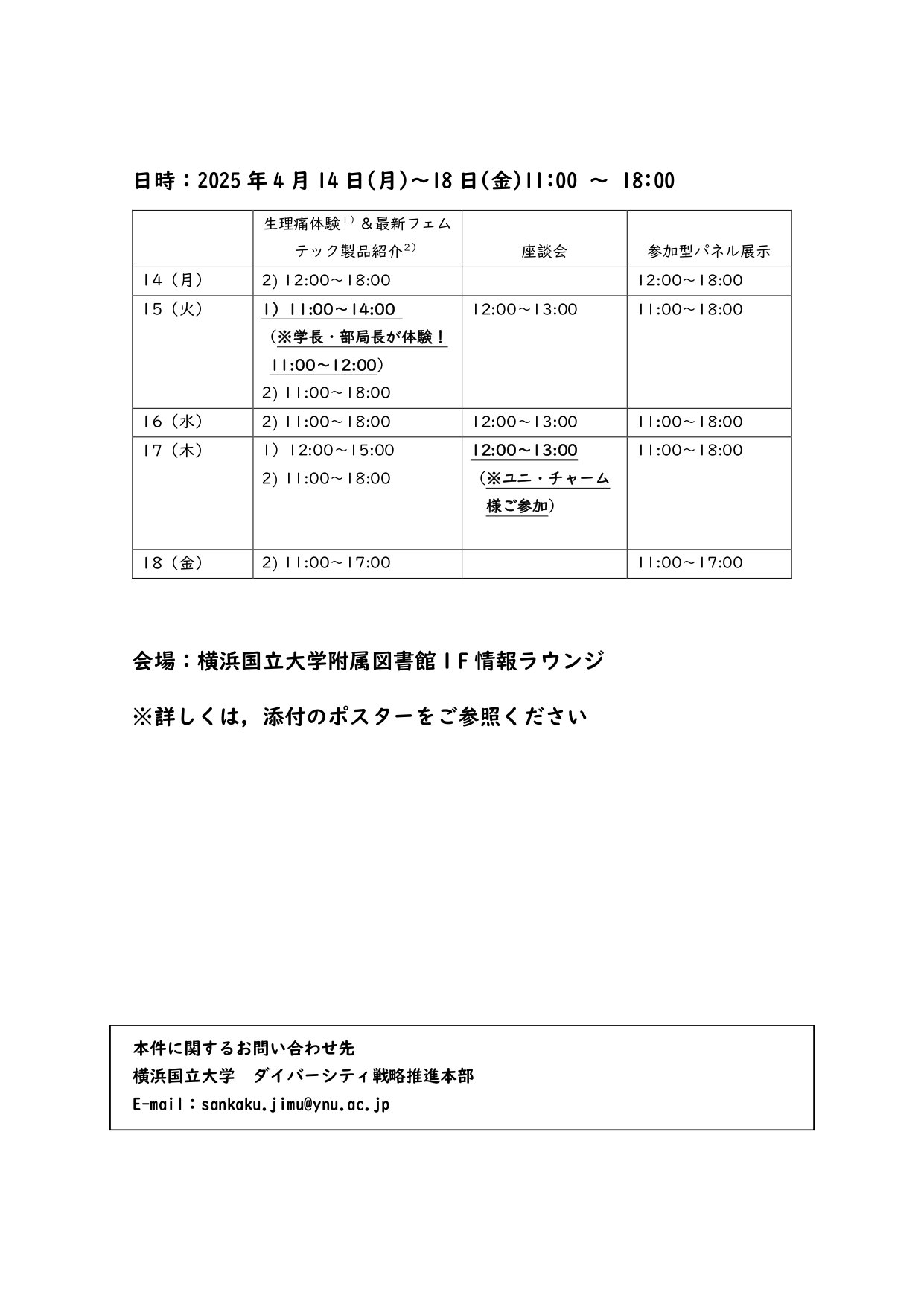 この協定の一環として、フェリス女学院大学ジェンダースタディーズセンターは、横浜国立大学ダイバーシティ戦略推進本部が株式会社ユニ・チャームの協力を得て企画した「あなたにとっての"生理"って?」と題した展示に協力しています。生理に関する知識や対話を促進するため、生理痛体験ブース、最新フェムテック製品紹介、座談会、参加型パネル展示などが実施されます。