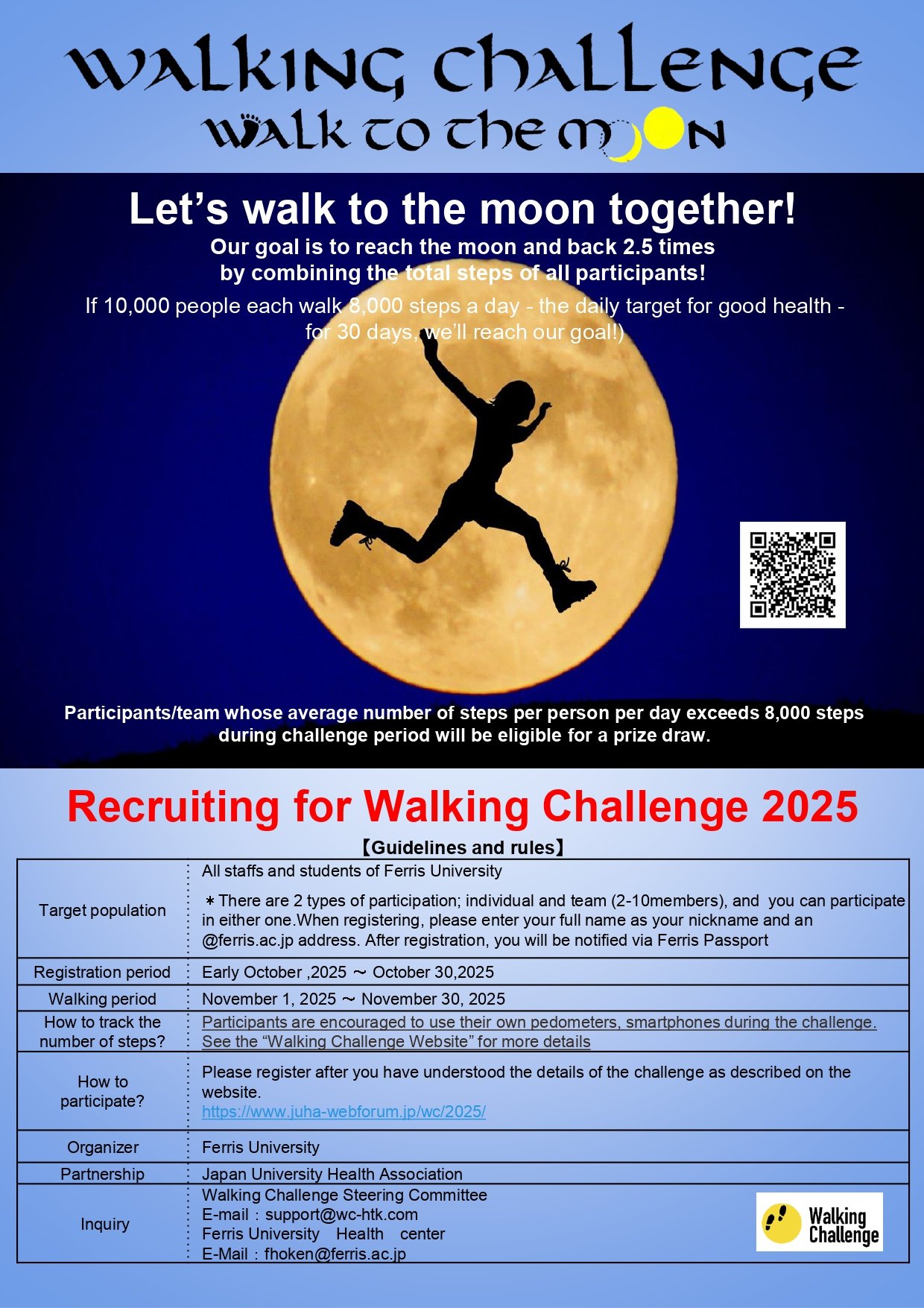 ウォーキングチャレンジは、2018年京都市内の7大学がヘルシーキャンパス京都ネットワークとして健康文化の発信や定着を目的として始まり、2021年からは全国大学保健管理協会が共催し、全国の大学に広がっています。2000人が1日8000歩を30日間歩くと、月まで到達します。