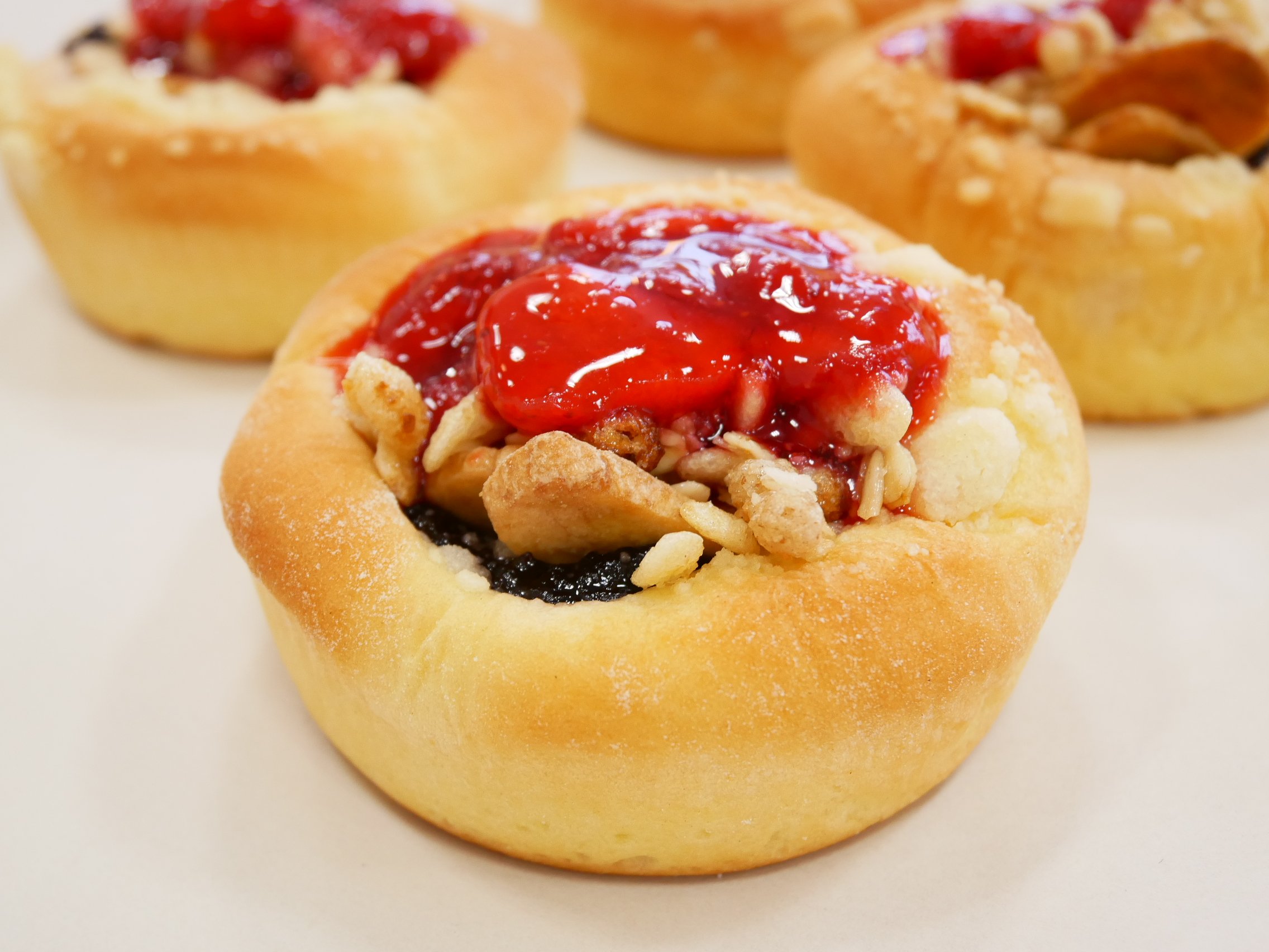 アサイーボウルを再現したパン。アサイーのジャム、ヨーグルトソース、グラノーラがトッピングされ、いろんな味が楽しめます。