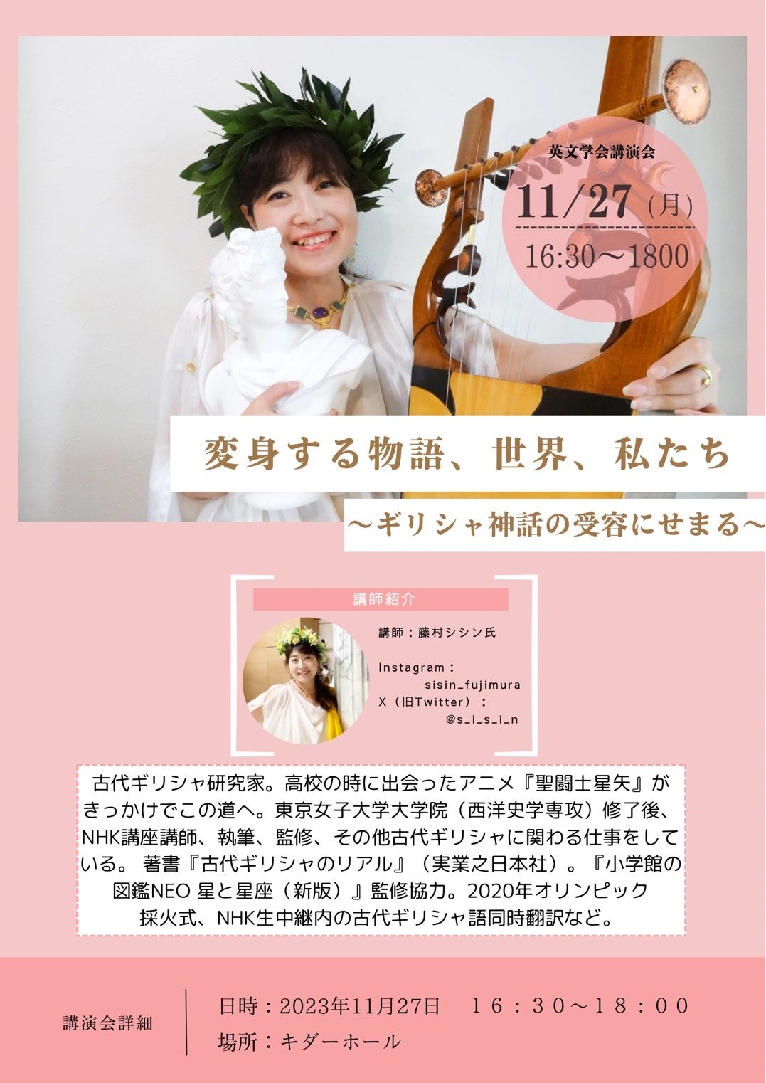 お知らせ英文学会主催講演会「変身する物語、世界、私たち ~ギリシャ神話の受容にせまる~」を開催します ※学内者限定