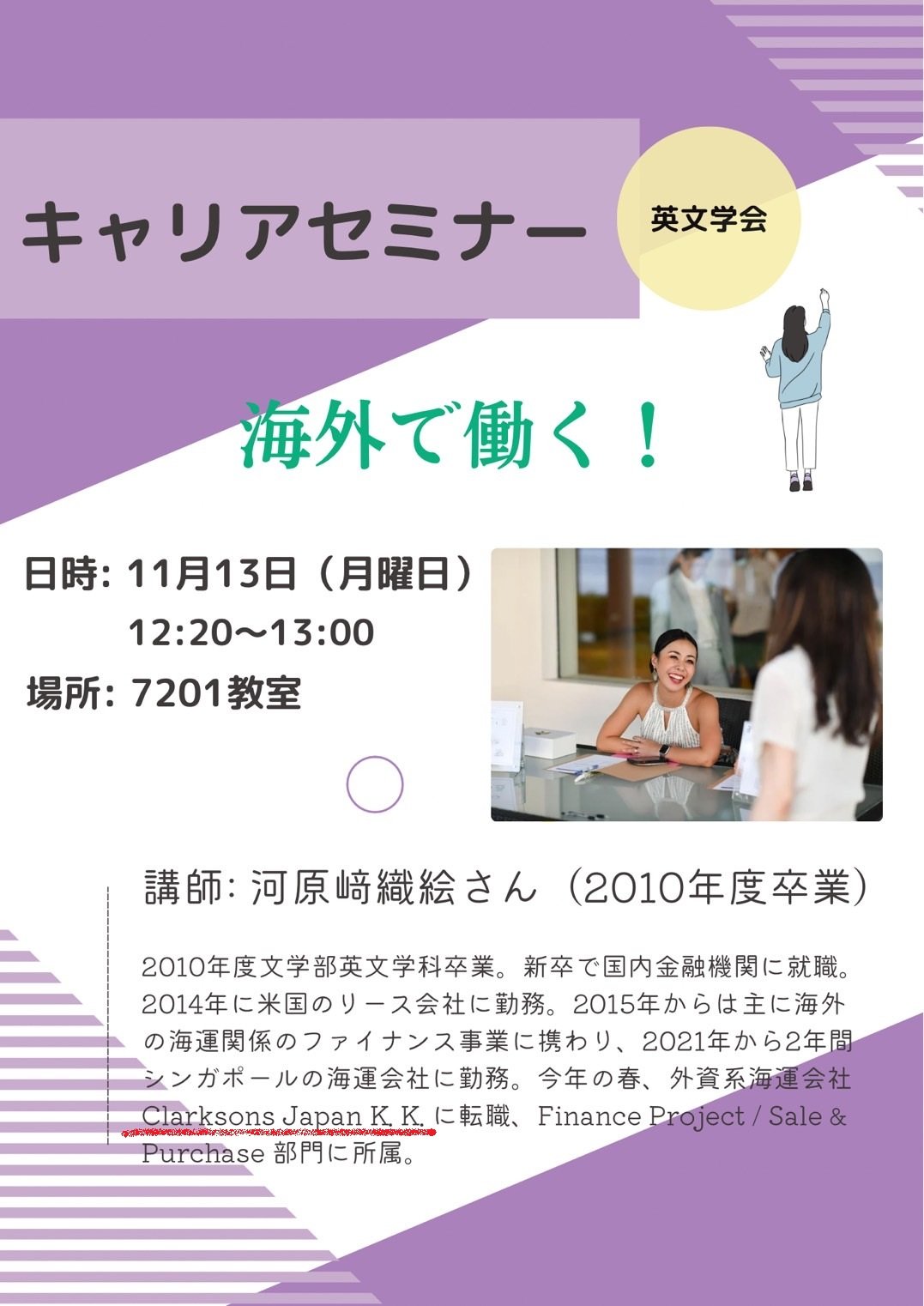 お知らせ英文学会主催のキャリアセミナー「海外で働く!」を開催します