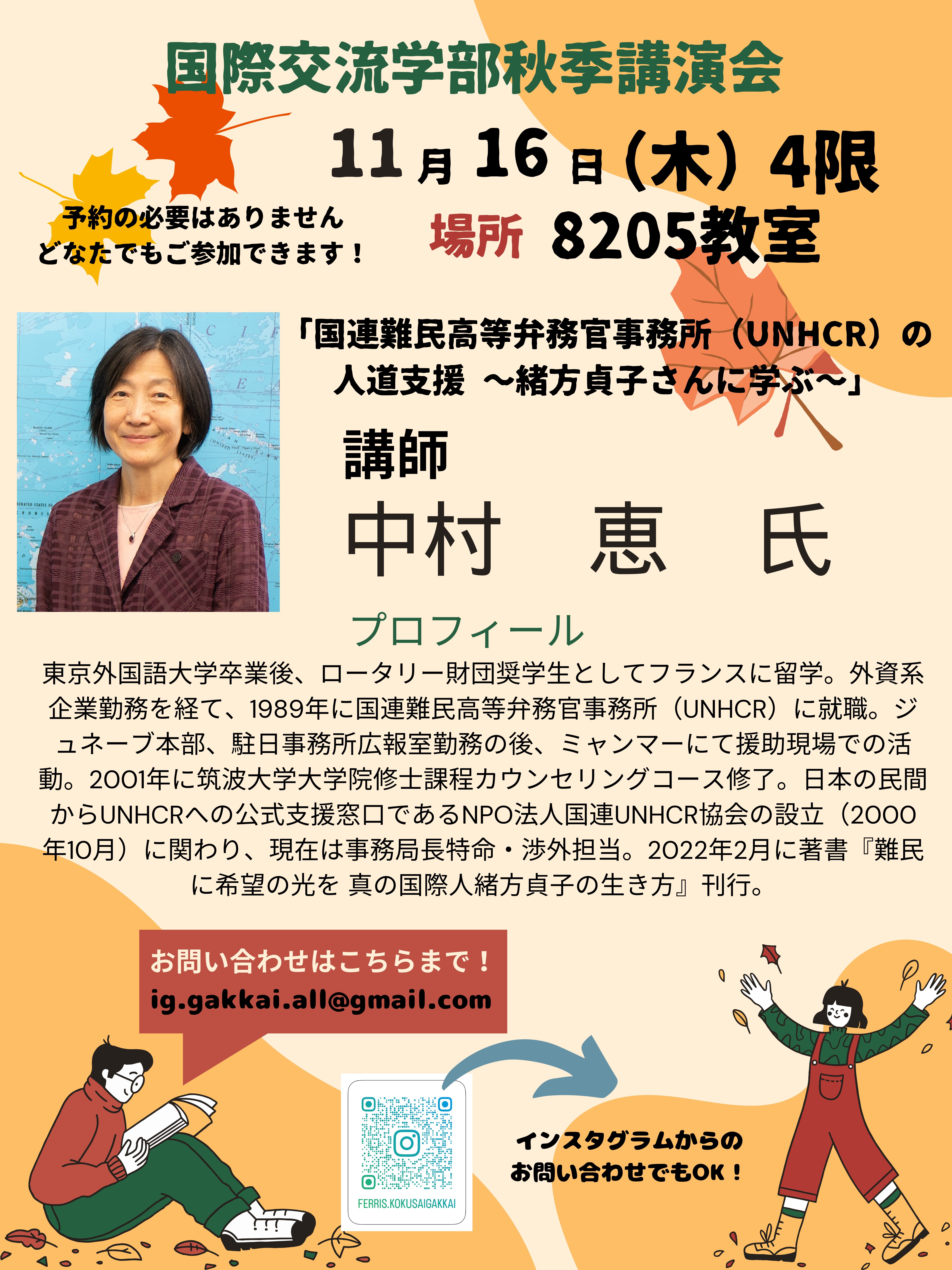 お知らせ国際交流学会・秋季講演会「国連難民高等弁務官事務所(UNHCR)の人道支援 ~緒方貞子さんに学ぶ~」を開催します※学内者限定