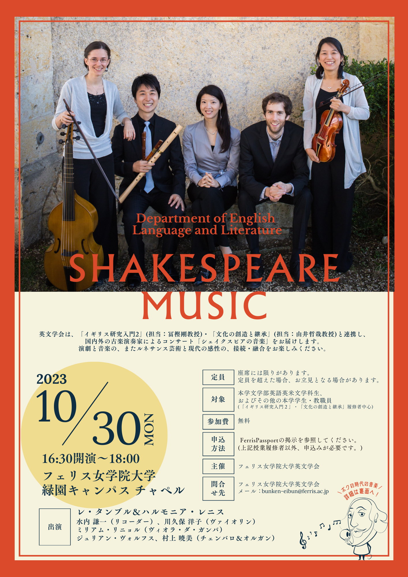 メディアフェリス女学院大学英文学会が演劇・音楽融合型コンサート-「シェイクスピアの音楽」を2023年10月30日(月)に開催-