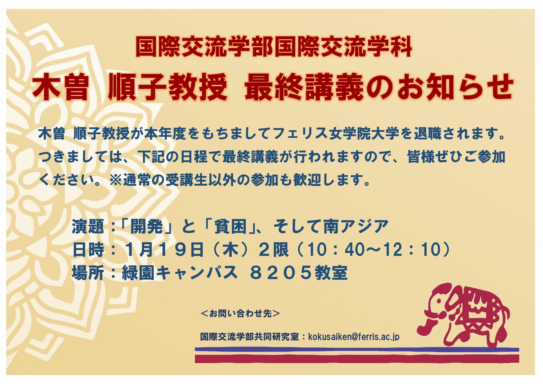 お知らせ国際交流学部・木曽 順子教授 最終講義のお知らせ